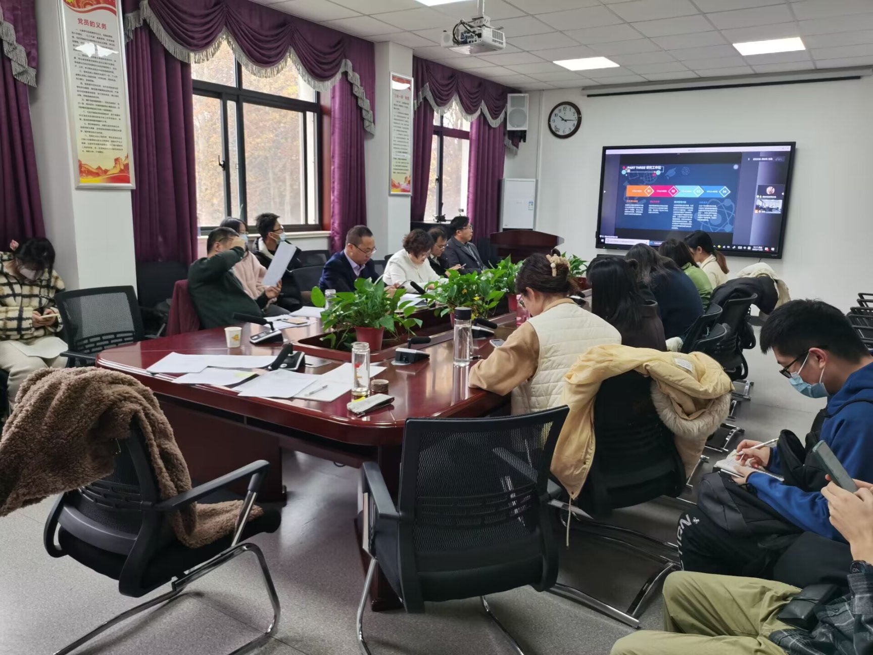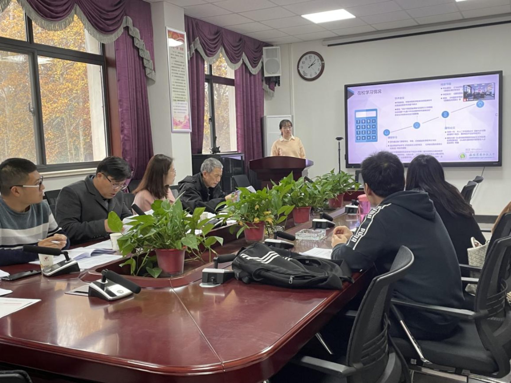 中期考核汇报会上,学生向评委提交了个人总结报告和读书报告,并对个人论文进展情况、取得的阶段性成果、存在的困难、解决方案及预计完成的时间等进行了详细的汇报。考核小组的评委老师们对每位学生研究能力、研究进展、工作成效等方面的汇报进行了一一点评,给出宝贵的建议和意见。