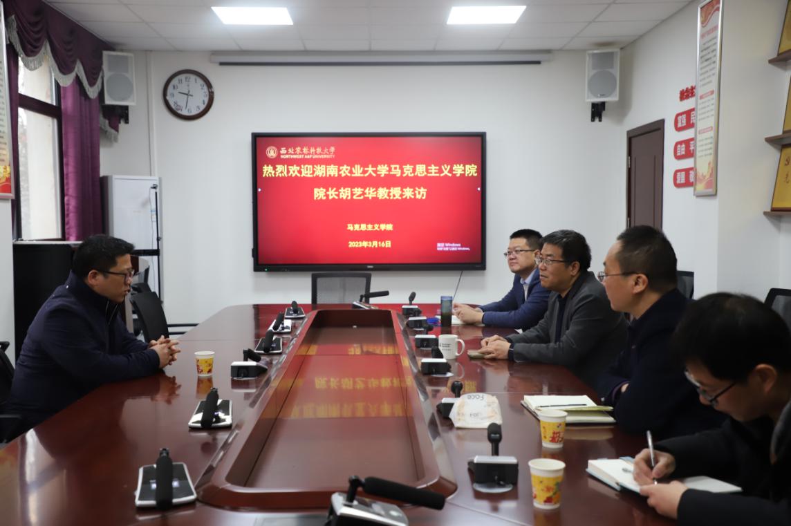 3月16日,湖南农业大学马克思主义学院院长胡艺华教授来院交流。学院党委书记、院长赵延安教授、高小升副院长、杨鹏副院长、殷旭辉副院长参加会议。