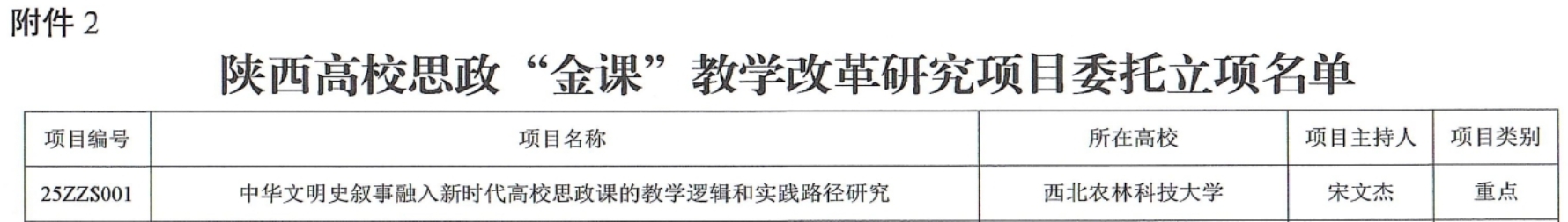近日,陕西省教工委公布了关于设立2025年陕西高校思政“金课”教学改革研究委托项目的立项名单,其中设立重点项目10项,一般项目20项。我院宋文杰副教授申报的“中华文明史叙事融入新时代高校思政课的教学逻辑和实践路径研究”成功立项为重点课题。