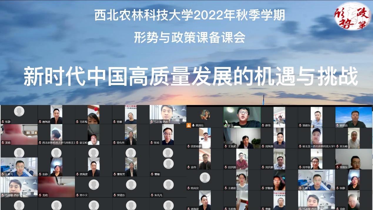 会议由马克思主义学院的两名助教同学对八个课程主题作简要介绍。参会教师围绕课程主题及教学经验展开讨论。水土保持研究所的党委副书记韩锁昌老师提出三点主张:第一,关注“形势与政策”课的开设目的。思政课是高校立德树人的关键课程,思政课建设是目前高校的重点工作,在“大思政课体系”的框架下,全校各院教师都是思政教育的主体,因此大家要积极转变思政课的教学理念,共同参与并建设好“形势与政策”课程的教学工作。第二,充分考虑学生的兴趣,了解学生思想状况,创新教学形式,提升学生的课堂参与度和获得感。第三,提高认识,根据自己的知识体系扎实备课,学习和了解国际国内形势,掌握前沿动态。经管学院的张静老师提出任课教师要结合本校实际和疫情大背景,做到理论联系实际,在讲课的过程中启发学生,通过具体事例彰显社会主义制度的优越性,激发学生爱党爱国的热情。