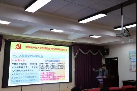9月28日下午,学院党委副书记王家武老师以“入党誓词的内涵及其历史沿革”为题,为全体研究生讲授了一趟重要党课。他从入党誓言起源于《共产主义者同盟章程》讲起,以时间为轴,从大革命和土地革命时期、抗日战争时期、解放战争时期、新中国成立前后、党的十二大以来五个阶段,向同学们展开了一幅入党誓词发展演变的宏伟画卷。并对现行党章规定的入党誓词12句80个字的内涵逐一进行了解读。听完党课后,同学们走到前台,面对鲜红的党旗,庄严宣誓,“我志愿加入中国共产党.........,随时准备为党和人民牺牲一切,永不叛党”。生动的党课,铿锵的誓言,更加坚定了同学们的理想信念,不忘初心,红心向党。