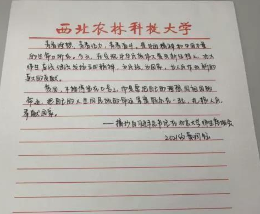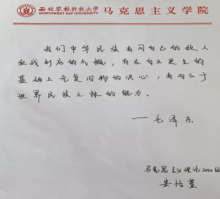 为了更好庆祝祖国华诞,我院多名学子发挥抒发与文笔特长,书写强国誓言、抒发爱国情怀。2020级研究生团支部书记周映柯同学书写软笔作品《请党放心,强国有我》,一撇一捺写尽马院青年爱国情怀;马院研究生会心理部部长张葭蔚、文体部部长黄楚娟两位同学,在其爱国承诺书中纷纷表表达“我们青年一代有决心在新征程中跑出一个好成绩”、“要让自己在实践中增长才干”的青春亮丽底色;2020级研究生安怡萱、2021级研究生黄润钰以手抄经典名言的形式表达民族的自信心与青春的战斗力,积极抒发爱国情;2021级研究生何晓东手抄于右任爱国诗作《望大陆》并手写《给于右任先生的一封信》,回顾于右任先生为我国革命及教育事业作出的突出贡献,用谆谆誓言表达爱校爱党爱国之情;2021级研究生张世煜自创诗歌《何不爱中华》,“何不爱中华,那是胸中红色血脉的勋章”……深情表达对革命先烈的怀念与对祖国的热爱。